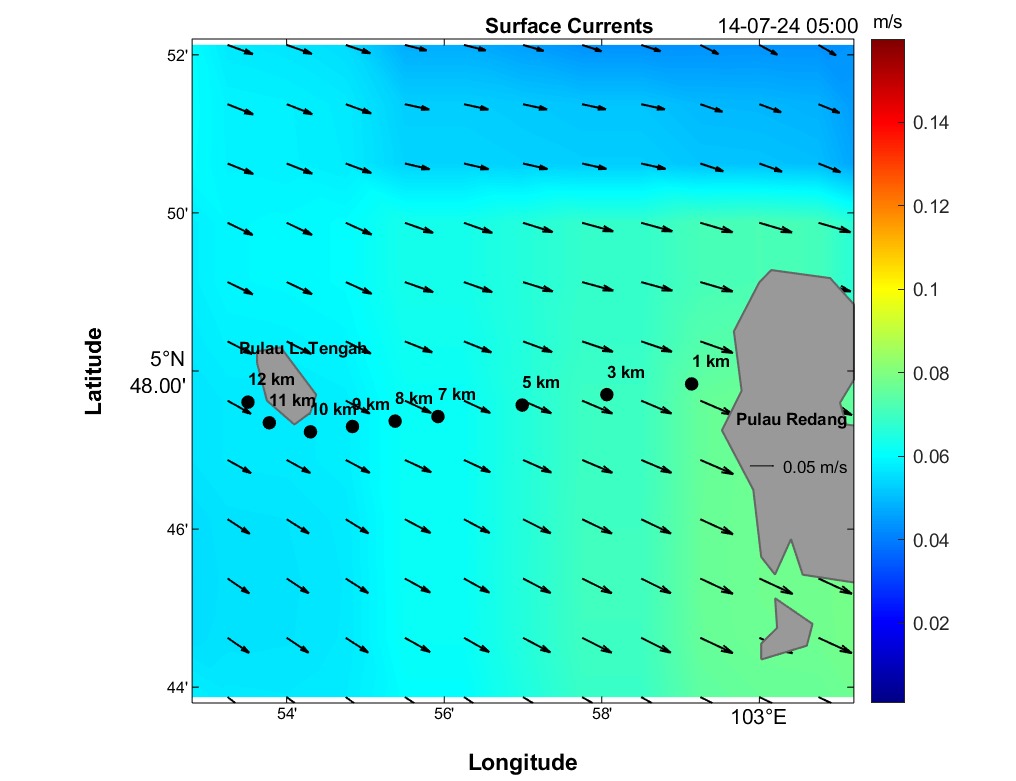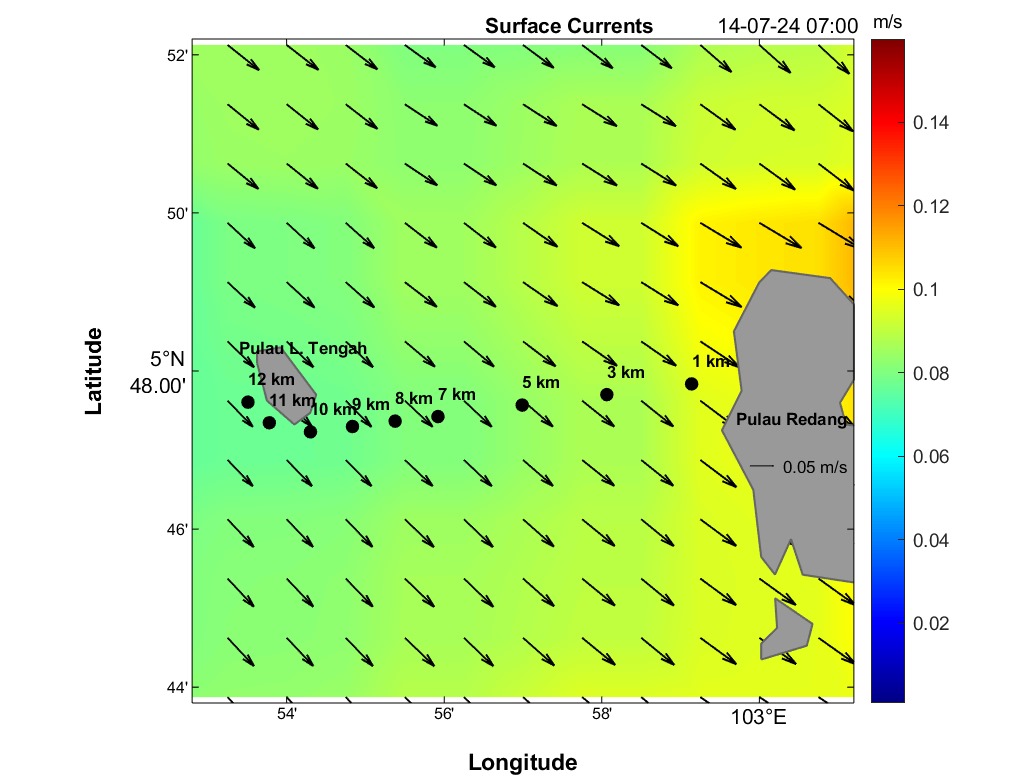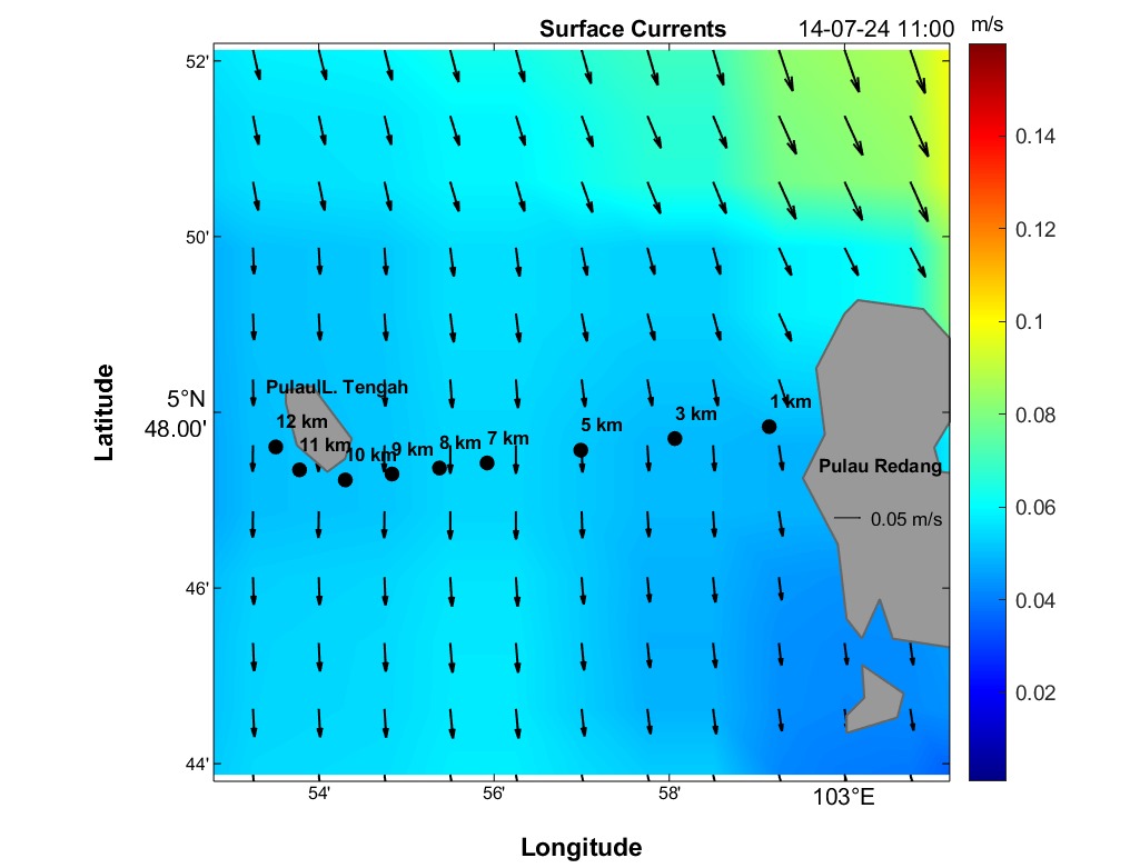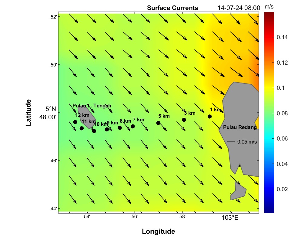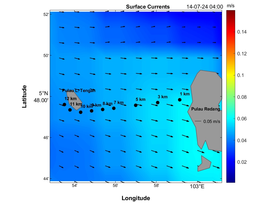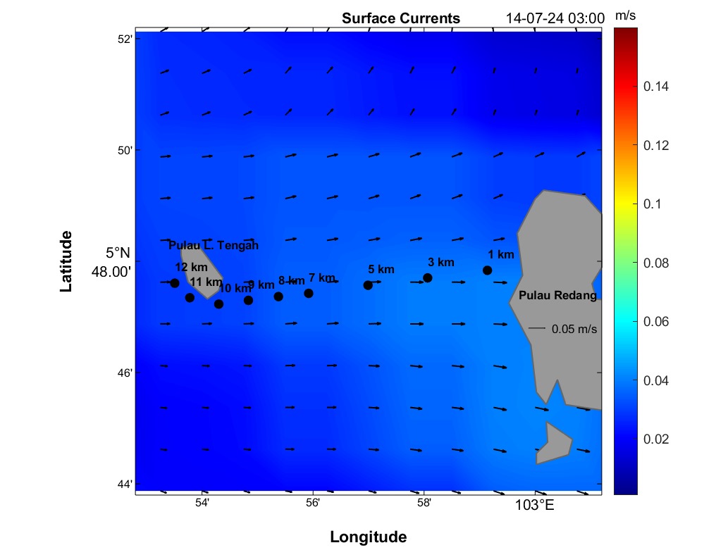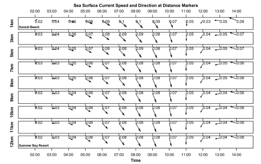 The second panel displays a time series of current speed (numerical values) and direction (arrows) for each distance marker. Time is on the horizontal axis, and the distance is between Redang Island and Lang Tengah Island. Although this plot contains the same information as the maps, it provides a more detailed view of direction and speed for any HOUR/DISTANCE combination. Arrows indicate the compass direction (north-south-east-west) an object would drift following surface currents. For instance, swimmers can use this plot to estimate expected currents along their route based on swim speed at any given distance and time.