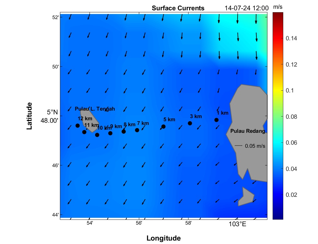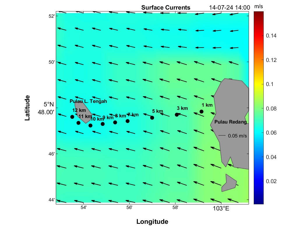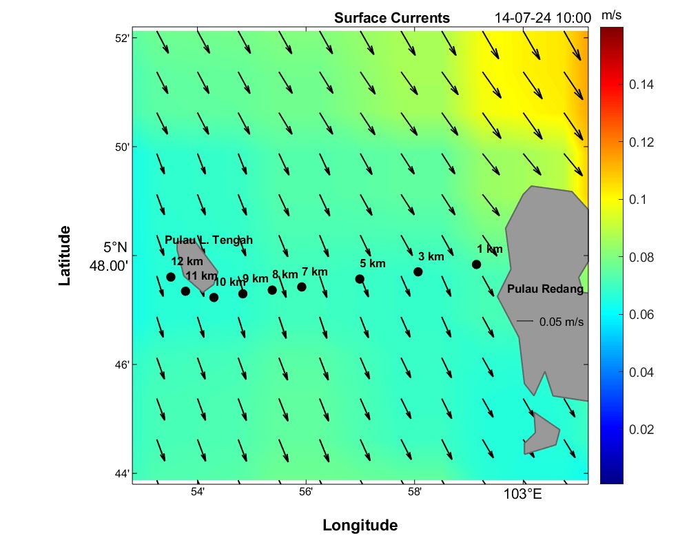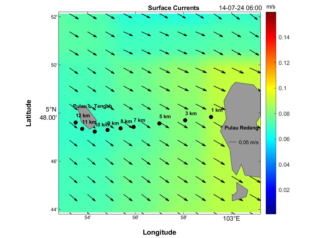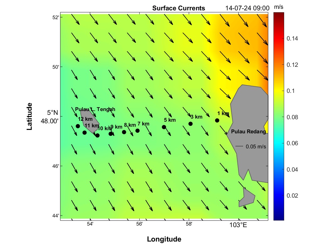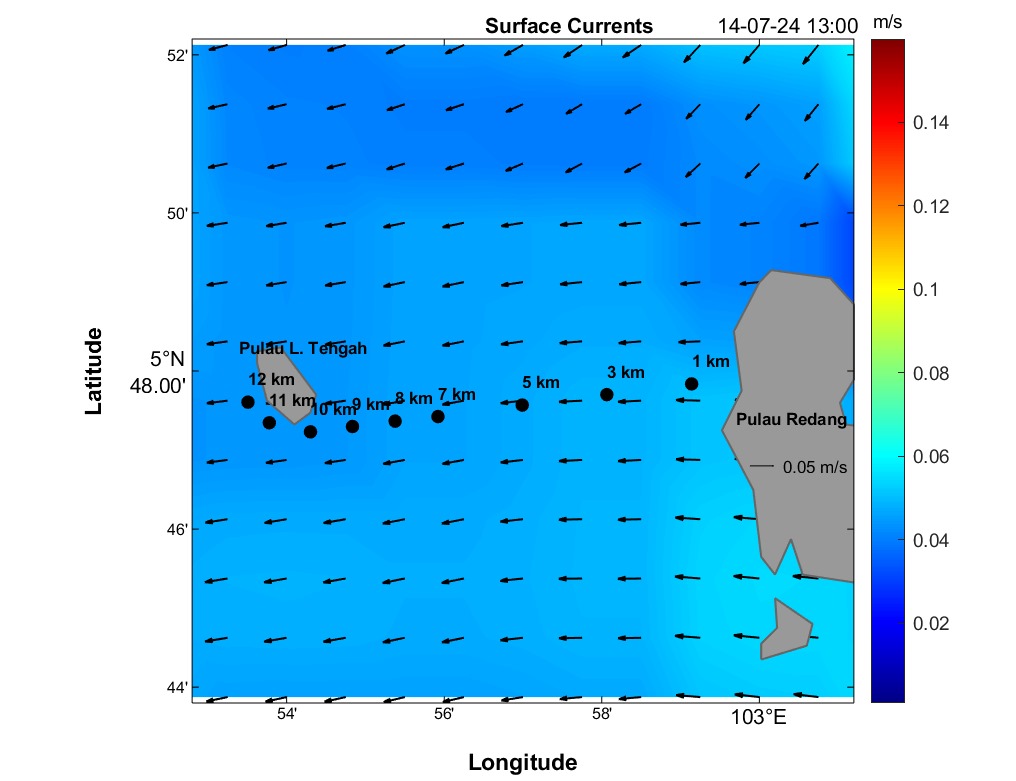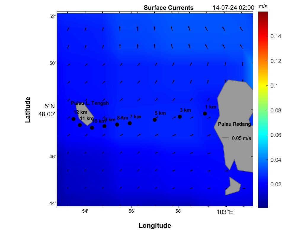 The second panel displays a time series of current speed (numerical values) and direction (arrows) for each distance marker. Time is on the horizontal axis, and the distance is between Redang Island and Lang Tengah Island. Although this plot contains the same information as the maps, it provides a more detailed view of direction and speed for any HOUR/DISTANCE combination. Arrows indicate the compass direction (north-south-east-west) an object would drift following surface currents. For instance, swimmers can use this plot to estimate expected currents along their route based on swim speed at any given distance and time.