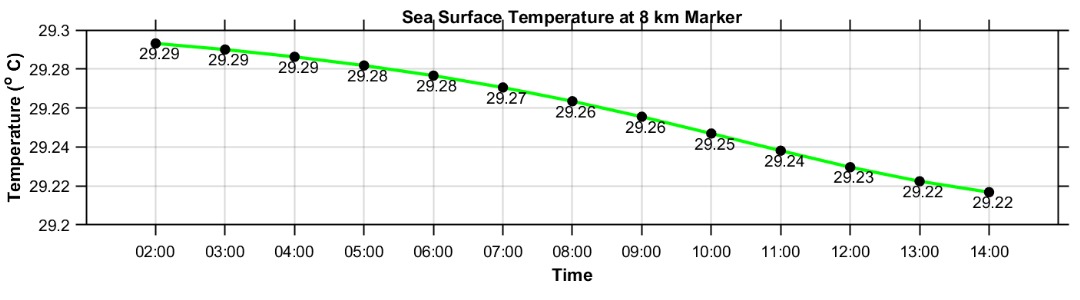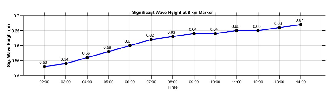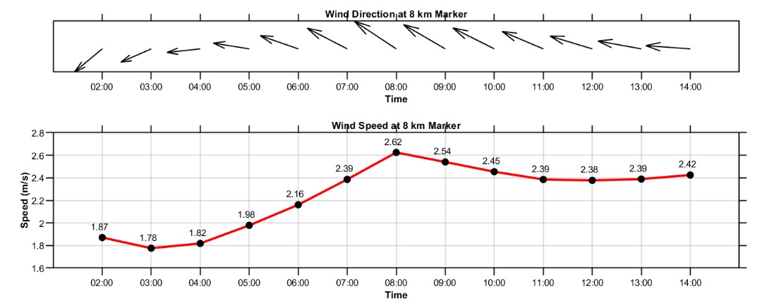 The third panel exhibits predicted hourly wind speed and direction in the middle of the swimming route, synchronizing with the figure above. Wind speed is represented by a red line, and wind direction is indicated by black arrows. Wind conditions are crucial for favorable swimming conditions, with speeds below 10 knots (5.14 m/s) considered desirable. Monitoring wind arrow direction is important, as a sudden change often signals the arrival of the sea breeze, indicating a rapid deterioration of ocean conditions. While exact sea breeze timing is challenging to forecast, this figure offers insight into its potential early or late arrival, to be interpreted alongside official weather forecasts from the Malaysia Meteorological Department.